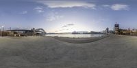 an oval shaped panorama with the sun setting on the water and a bridge in the distance