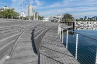 there is an empty wooden stage on a boardwalk near water and a city in the distance