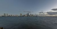 This is an image of the Miami Beach coastline at dawn in Florida. The clear sky above illuminates the Miami skyline, creating a picturesque scene. The open space allows for a breathtaking view of the ocean, with gentle waves crashing onto the shore. The image captures the beauty and tranquility of Miami Beach, a popular coastal destination in Florida. This photo represents a sunny day at the beach, with clear skies and a vibrant atmosphere.