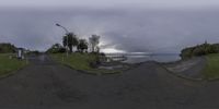 the view of an intersection with a street and a body of water in the background