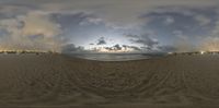 a fish eye view of the ocean and sand with a cloud in the background in a panoramic style