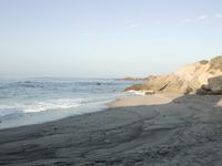 This is an image of a scenic coastal landscape with a sandy beach and clear blue waters. The photo captures a sunny day with an open space of ocean and a beautiful horizon in the distance. A headland or promontory can be seen jutting out into the sea, creating an interesting terrain. The shore is lined with gentle waves gently crashing onto the beach. This picturesque view represents the tranquility and natural beauty of a coastal environment.