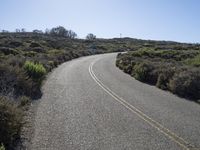 A scenic drive along the coastal road in Montaña de Oro State Park, California. The asphalt road winds through a picturesque landscape with clear skies and views of the ocean. Surrounding nature and trees create a peaceful and relaxing atmosphere.