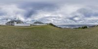 two white buildings standing on a green hillside near the ocean with clouds overhead and blue sky