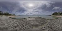 a fish eye lens picture shows the view of water, beach and a dock at a pier