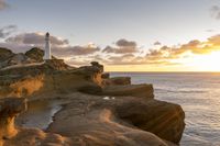 A breathtaking coastal landscape at dawn, with the sun visible above the ocean. The sunlight illuminates the rocky surface and the lighthouse, creating a stunning afterglow. Clouds and contrails add to the atmosphere of this sunny scene.