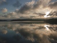 a large body of water with trees in the background and clouds above it and sun reflecting on the water