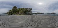 A serene coastal landscape with a dock leading to a waterway surrounded by trees and shrubs. The horizon stretches out over the open space, providing a tranquil view of the ocean and highlands in the distance.