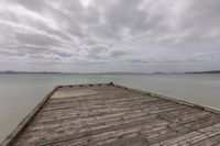 a cloudy day over the water and a wooden dock near a large body of water