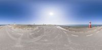 A fish-eye lens captures the tranquil coastal landscape of Holland. An empty asphalt road stretches towards the horizon, with the azure water of the ocean on one side and a picturesque lighthouse on the other.