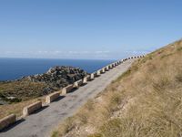 An elevated road with Armco barriers overlooking the coastal landscape of Mallorca, Balearic Islands. The high road provides stunning views of the clear sky and the sparkling ocean waters. A perfect day to explore the scenic beauty of Europe.