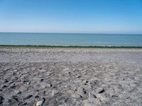 A serene coastal landscape in the Netherlands. Azure waves lap against the sandy shore, with cobblestone pathways leading to open spaces. The clear sky and horizon create a picturesque view of the natural environment.