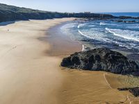 This stunning aerial view captures the coastal landscape in Portugal, Europe. The sandy beaches, clear azure waters, and rocky shores create a breathtaking natural environment. The elevated perspective showcases the open space and vastness of the terrain. The sunlight glistens on the high waves, highlighting the beauty of the water resources. The clear sky adds to the picturesque scenery, making it an ideal spot for a day of relaxation and enjoyment in nature.
