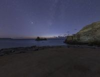 A serene coastal landscape in Portugal. The clear night sky is filled with sparkling stars, reflecting on the calm ocean surface. The silhouette of a cliff and a boat ramp add to the natural beauty of this European open space.