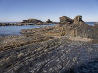 Porth d'alife in Portugal offers a stunning coastal landscape with a large rock formation by the ocean. Clear sky and open space accentuate its natural beauty. A perfect day for exploring the beach.