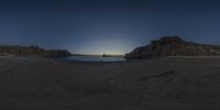 A stunning sunset on a coastal beach in Portugal. The rocky formations in the foreground create a dramatic landscape. The clear sky and calm water reflect the colors of the sunset. The perfect spot to end the day.