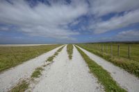 A POV shot of a road stretching through a coastal landscape. The grass and vegetation on either side mix with the sandy beach and ocean waves. A clear sky dotted with cumulus clouds overhead.