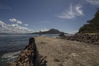 rocks on the ocean shore near a rock wall and an island with trees in the distance