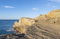This stunning stock photo features a picturesque coastal landscape with a beautiful sandy beach and a rocky outcropping. The crystal-clear waters of the ocean stretch out towards the horizon, reflecting the clear sky above. In the distance, an airplane gracefully glides through the open space, leaving contrails in its wake. The rugged terrain of the bedrock cliff adds a touch of drama to the scene, contrasting with the calm and peaceful atmosphere. The sunlight bathes the entire landscape, illuminating the hillside and highlighting the various rock formations. With its combination of natural beauty and serene ambiance, this image is perfect for any project that requires a captivating coastal setting.
