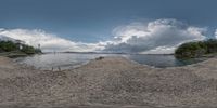a panoramic image shows the sand dunes next to a body of water and a lighthouse in the distance