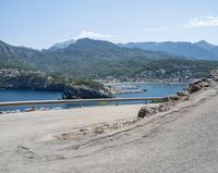 This is a photo of a coastal road in Spain, specifically in the beautiful Balearic Islands. The road is made of asphalt and runs along the coastline, offering a scenic view of the ocean, bay, and mountains in the distance. A bicycle rider is seen enjoying the day, riding down the road, while a motorcycle passes by. The clear sky and the Armco barrier add to the aesthetics of this landscape. The photo captures the natural beauty and the serene environment of this European coastal region.