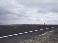 This is an image of an empty road in Fuerteventura, Spain. The road is surrounded by a wheat field and the cloudy grey sky creates a moody atmosphere. In the distance, you can see the vast ocean, adding to the coastal landscape. The road surface is made of asphalt and stretches towards the horizon, representing the infrastructure of the area. This photo captures the beauty of the European landscape and showcases the natural elements that make Fuerteventura unique.