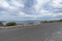 A coastal landscape with vegetation and road surface winding through highlands. Clouds dot the clear sky above, while the ocean water sparkles in the sunlight. A perfect day to explore nature.
