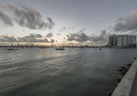 A stunning view of the Miami Beach coastline at dawn, with the city skyline in the background. Clouds fill the sky, reflecting in the calm ocean waters. The harbor bustles with activity in vibrant Miami.
