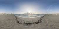 a fish eye lens with the beach and water in the back ground with sand in front of the camera