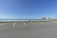 an empty parking lot with no cars in the parking lot near the ocean and cliffs in the background