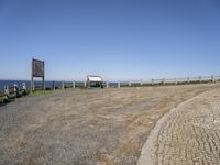 This is an image of a coastal parking lot in Portugal, Europe. The landscape shows a combination of sand, dirt, and asphalt surfaces. There is an open space with grass and vegetation, as well as a plain with a lake in the distance. The photo captures the peaceful nature of the area, with a clear sky overhead. A guard rail and fence provide safety and separate the parking lot from the rest of the landscape. This photo represents the European coastal scenery and the convenience of parking in this area.