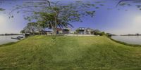 Panoramic view of a coastal residential area in Thailand. With houses surrounded by green grass and trees, the landscape offers a serene and natural environment. The clear sky and water add to the beauty of this idyllic location.