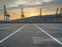 A stunning view of the coastal road in Barcelona, Spain at dawn. The asphalt surface extends straight down to the pier and harbor, offering an open space to enjoy the break of day. Clouds hover over the ocean, creating a picturesque coastline.