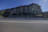 A scenic coastal road with winding asphalt leading to large cliff formations. Clear sky provides a breathtaking backdrop for the landscape. A lone car moves along the road, adding a touch of recreation to the natural beauty.