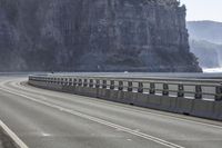 A coastal road winds along the edge of a cliff, with breathtaking views of the ocean and mountains. Guard rails and Armco barriers protect drivers along the road. The scenic landscape is highlighted by trees and rugged slopes.