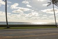 This is an image of a coastal road in Florida, USA. The asphalt road stretches along the shoreline with the sparkling ocean visible in the background. On both sides of the road, there is lush green grass and palm trees, creating a tropical landscape. The bright sunlight illuminates the scene, casting a golden glow on the road surface. In the distance, the horizon meets the sky, dotted with fluffy white clouds. This photo captures the perfect vacation vibes of Florida, with its sunny weather and beautiful coastal scenery.