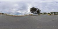 fisheye lens photograph showing a view of the sea and street at low tide of day