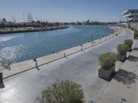 A modern architecture city in Valencia, Spain. Coastal road alongside the high sea, with roof walkways and urban design. The harbor features concrete piers and elevated walkways, surrounded by clear skies and vegetation.