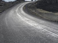 A scenic coastal road in Iceland, with a clear sky and rugged mountains in the background. The road surface is empty and paved, perfect for a day of walking amidst the stunning landscape.