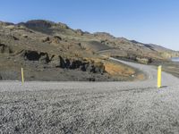This image captures a coastal road in Iceland, surrounded by a rugged mountain landscape. The road surface is rocky and uneven, reflecting the bedrock of the mountain range. On one side of the road, there is the vast expanse of the ocean, while on the other side, the slope of the mountains is covered in vegetation. The clear sky overhead adds to the breathtaking view. This photo showcases the natural beauty of Iceland and its unique landscape, making it a perfect representation of the country's scenic and adventurous spirit.
