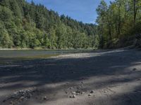 Top-down view of a coastal road, surrounded by lush vegetation and tall trees. The road surface transitions from asphalt to gravel, creating an elevated and scenic drive. Shadows cast by the high mountains and the deep blue ocean add depth to the landscape.