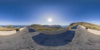 a panorama fisheye lens shot looking down a path in the distance is a scenic view of a valley