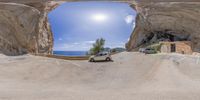 A car drives down the coastal road in Mallorca, Spain, passing by an entrance to a cave with a cliff. The clear sky and ocean create a picturesque landscape. Parking lot available nearby.