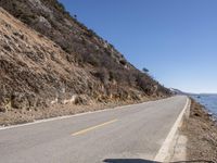 a long empty road next to the ocean in the mountains near some rocks and trees