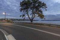 A gloomy night scene with grey sky and artificial light illuminating a coastal road. Guard rails and Armco barriers line the thoroughfare as trees and vegetation frame the scene. The road surface is covered in tar and asphalt, reflecting the street lights and the dark ocean water.