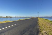 A coastal road running alongside the ocean, surrounded by lush grass and rolling hills. The clear sky enhances the natural beauty of the landscape. A perfect day for a drive along this scenic road.
