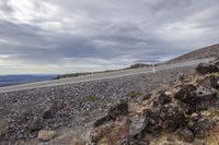 a large road with many rocks around it on the side of a hill and mountains in the distance