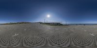 A serene coastal landscape in Portugal, with an open space and a calm ocean. The clear sky reflects on the smooth road surface, creating an azure fluid effect. Buildings in the background add to the city's charm.