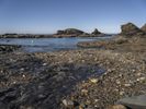 a tripod image of a road and some rocks and water underneath the sun on a clear day