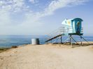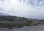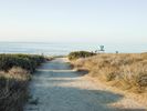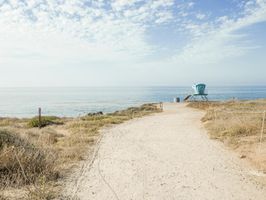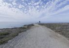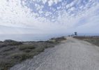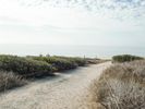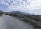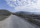 A scenic coastal road leading to a sandy beach. The rugged terrain and open space provide a wilderness atmosphere. Clear sky and mountainous landscape create a picturesque vacation destination.